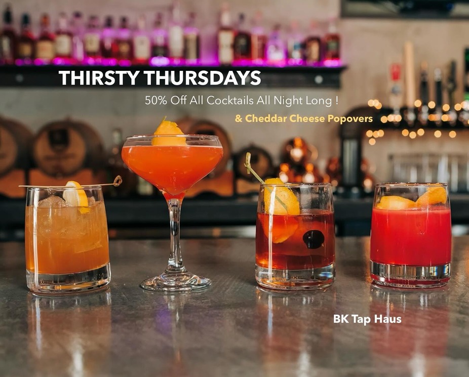 THIRSTY THURSDAYS! 50% off all cocktails and all beer, all night, long, no strings attached! And of course . . . Cheddar Cheese Popovers!